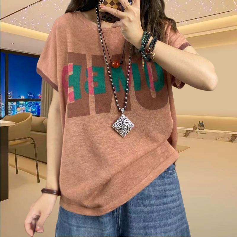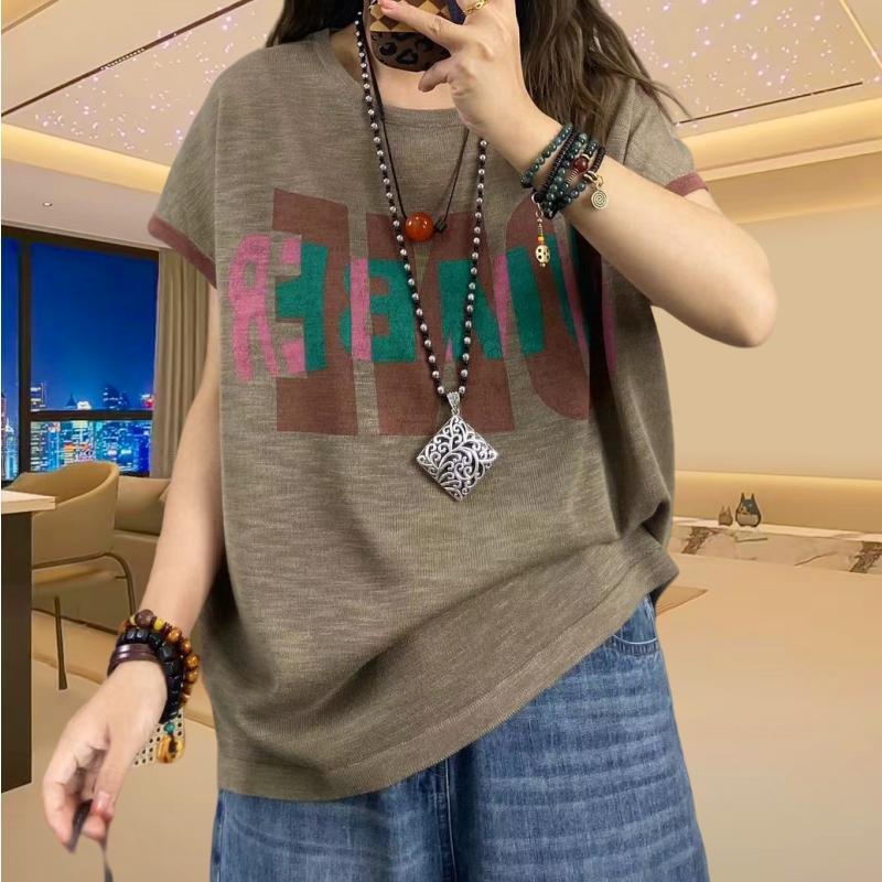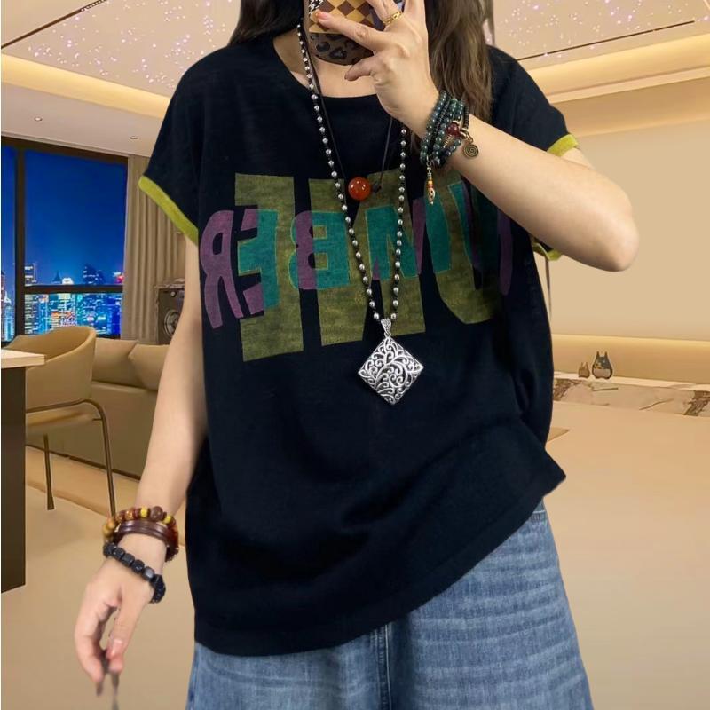 2025新款時尚氣質字母針織T恤 大碼寬鬆 百搭時尚 亞麻布料 涼爽透氣 多款選擇